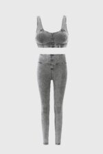 Experience the perfect blend of style and comfort with our Vintage Grey Sports Bra and Legging Set. Both pieces feature a unique front metal buttonhook and are crafted from a stretchy, lightweight, and breathable fabric for ultimate comfort. This matching set is perfect for your next workout or a relaxed day at home.
